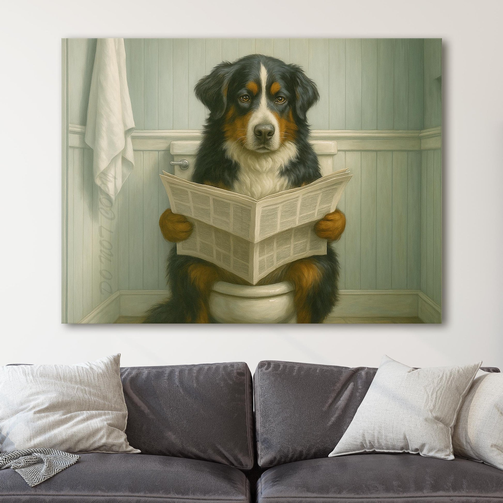 Bernese Mountain Dog Reading The Newspaper On The Toilet