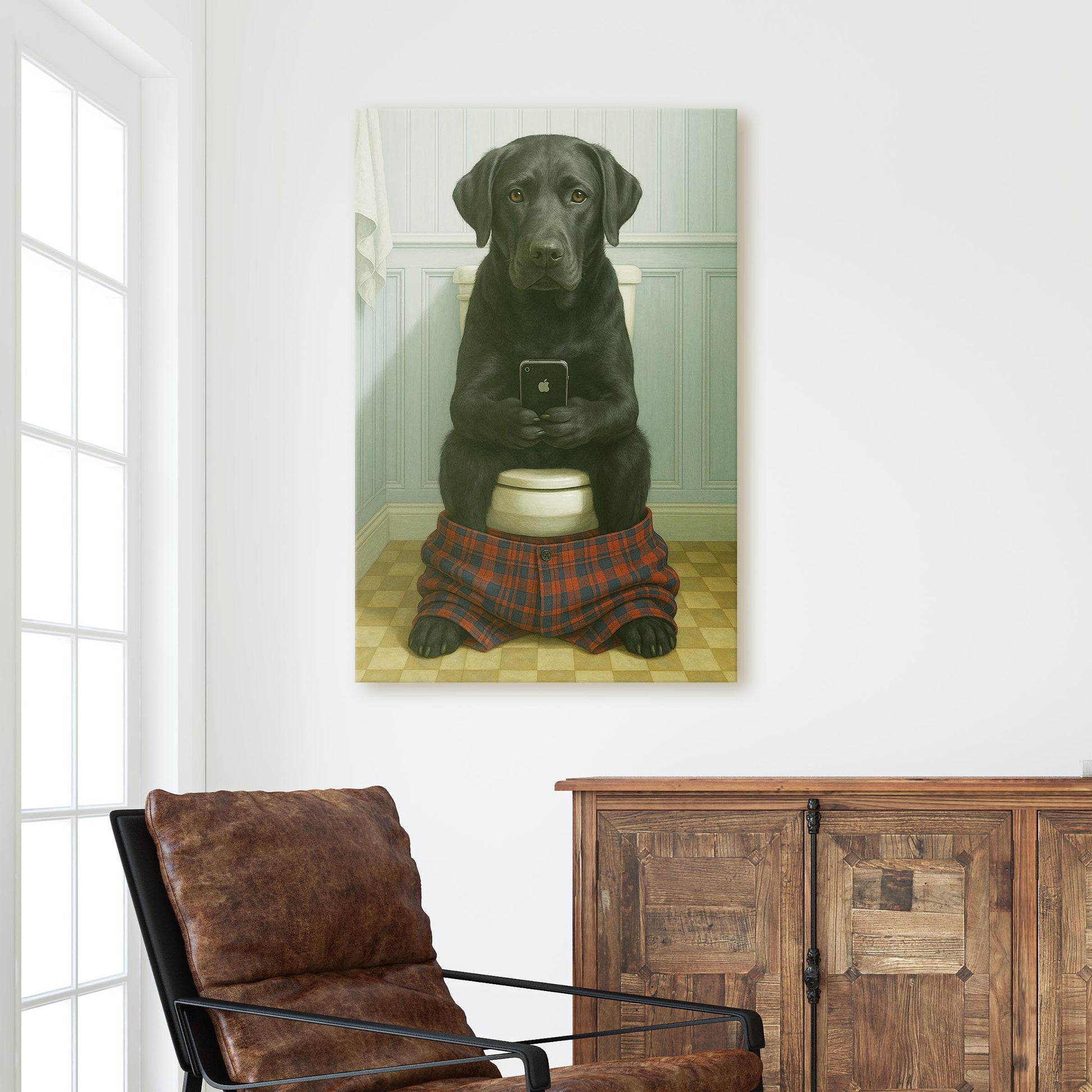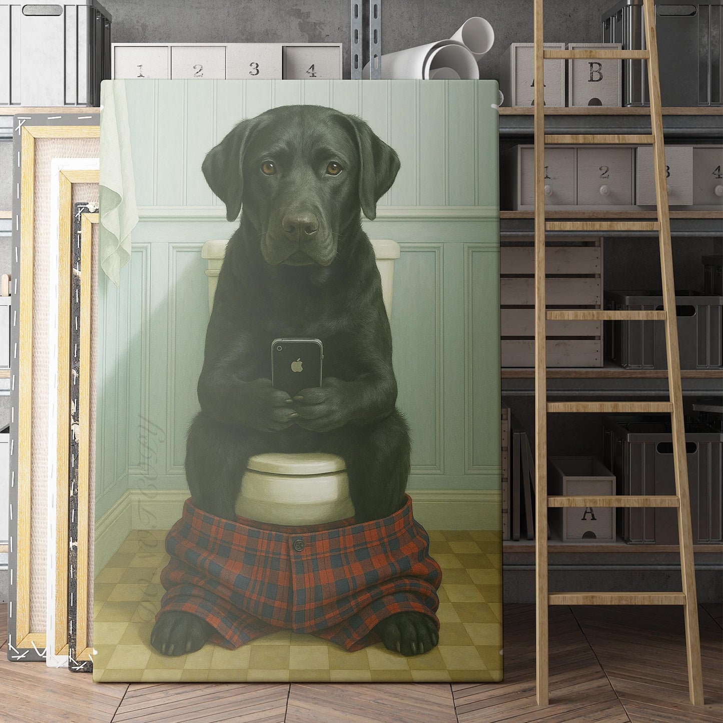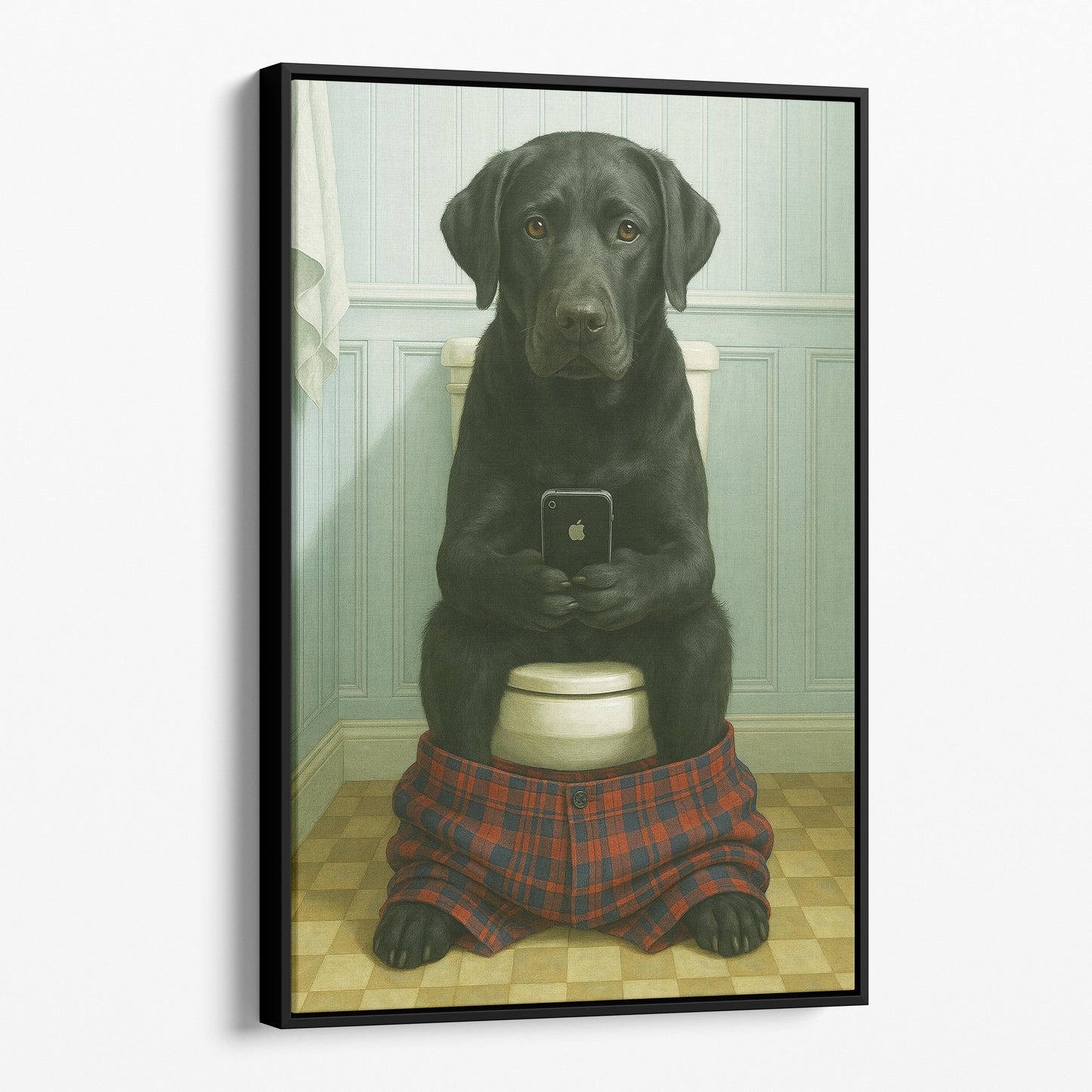 Black Labrador Retriever On The Phone On The Toilet