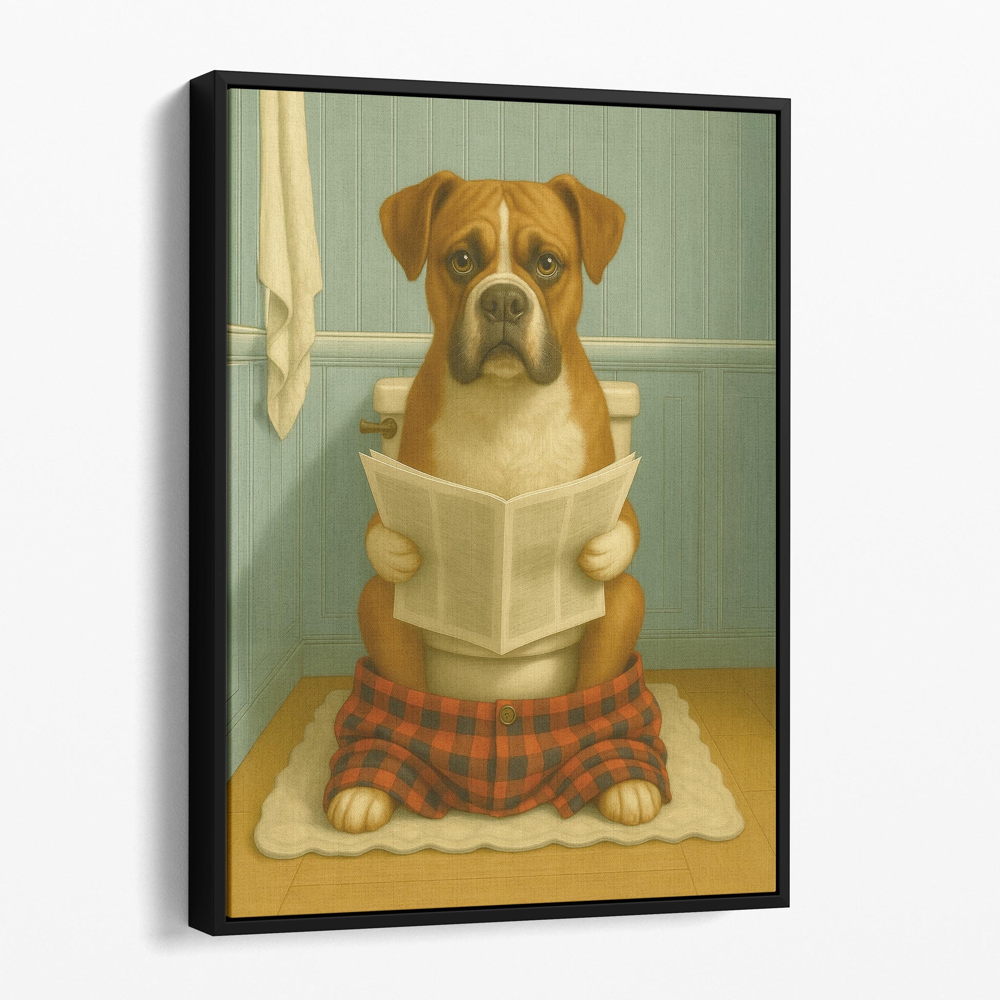 Boxer Dog Reading The Newspaper On The Toilet