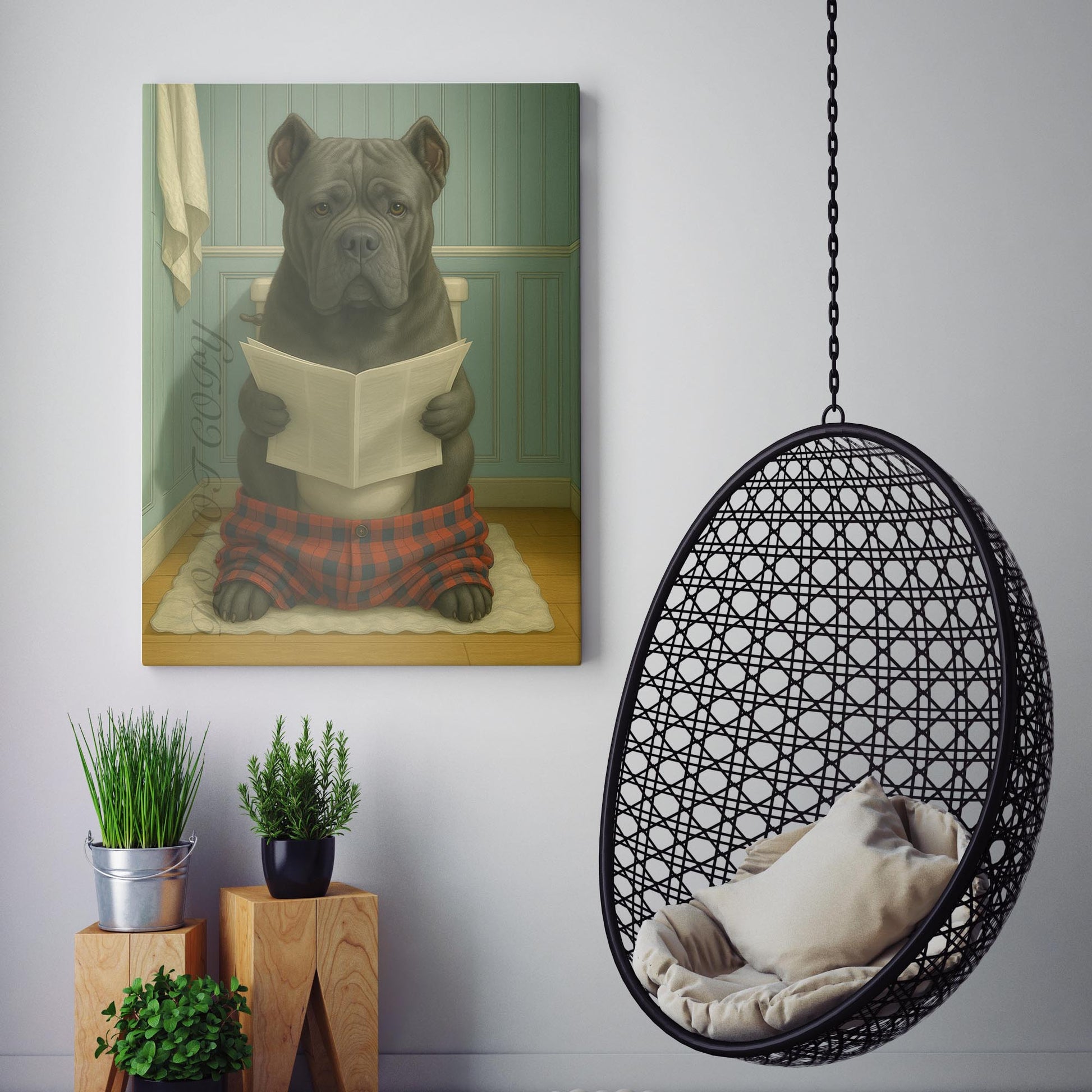 Cane Corso Dog Reading The Newspaper On The Toilet