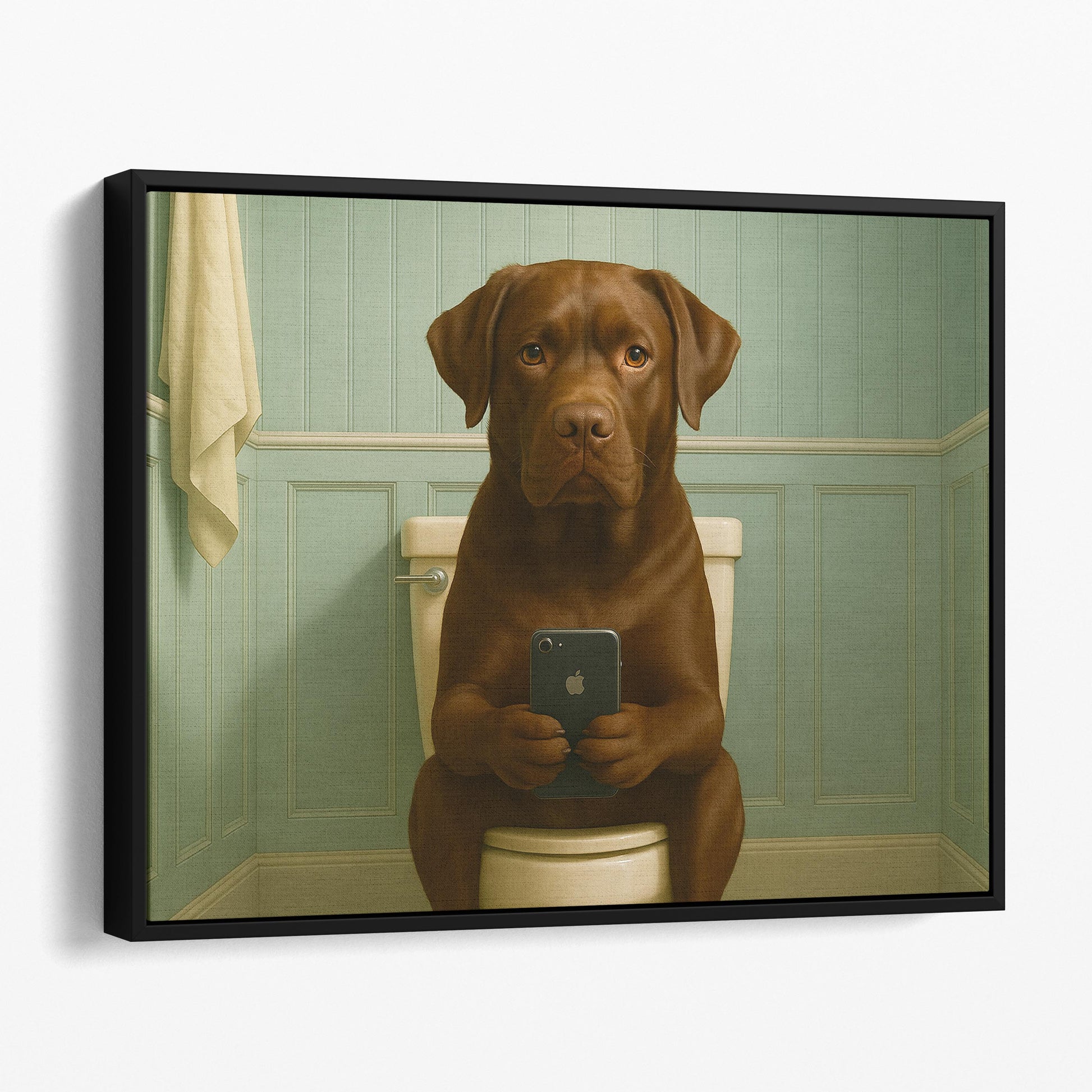 Chocolate Labrador Dog On The Phone On The Toilet
