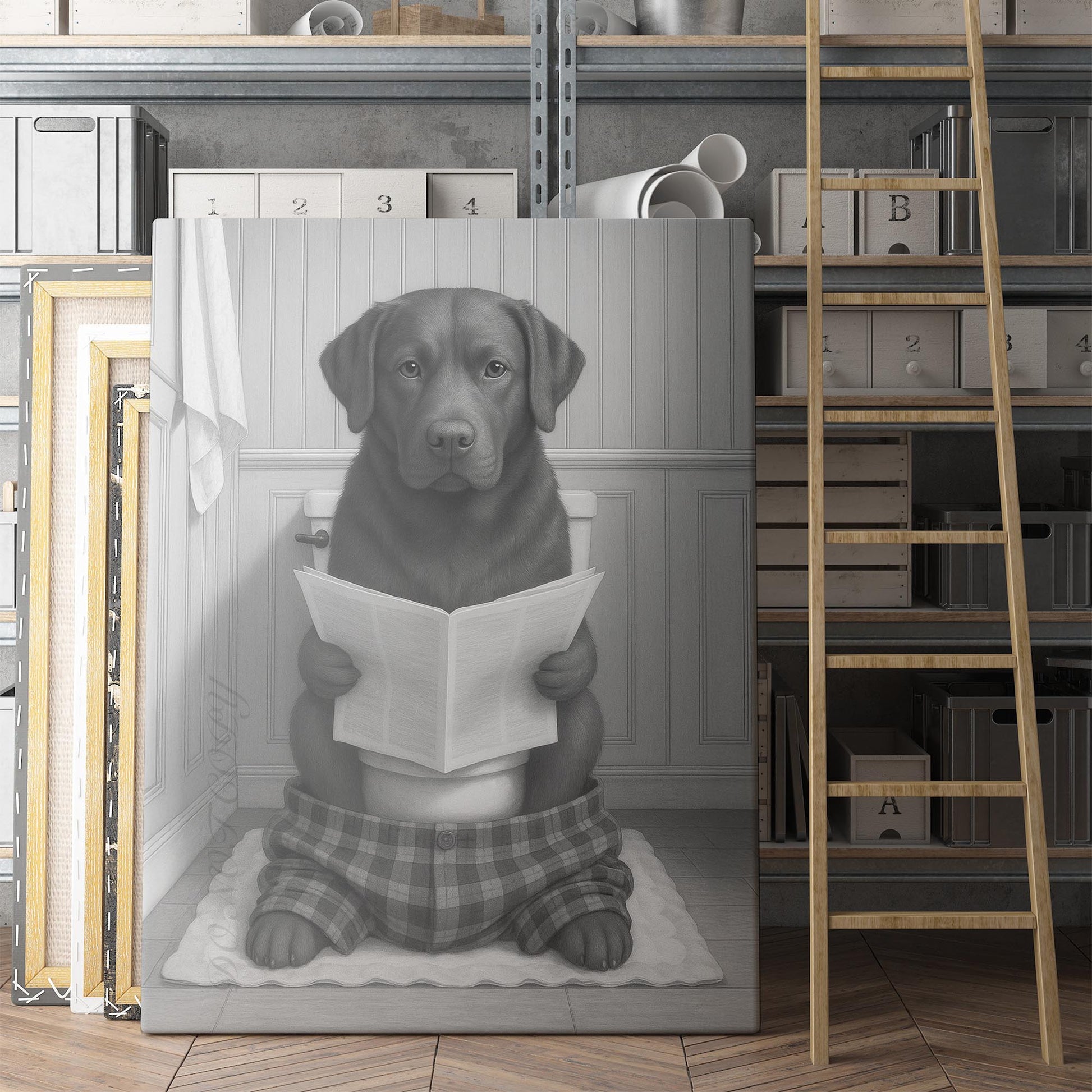 Chocolate Labrador Dog Reading The Newspaper On The Toilet