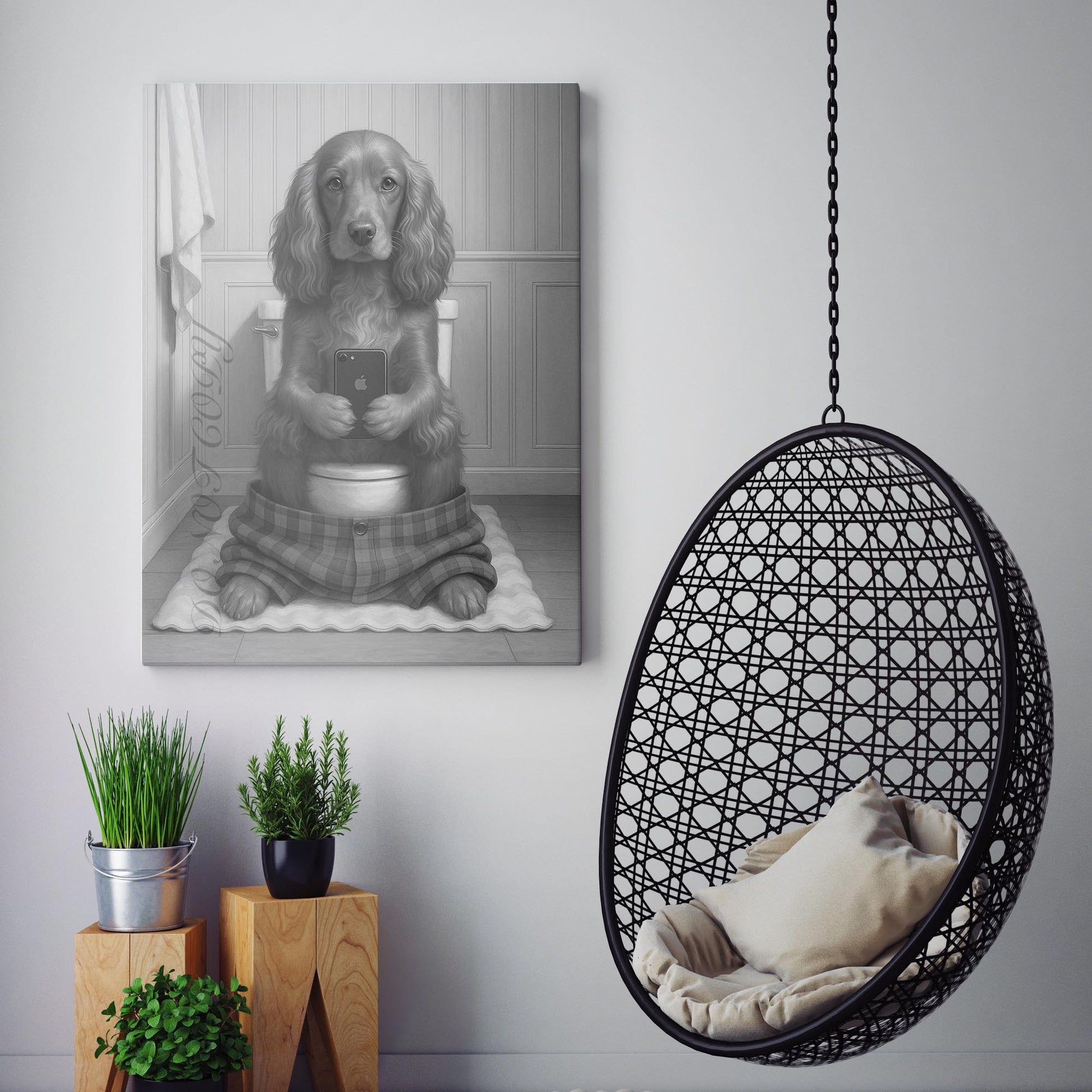 English Cocker Spaniel Dog On The Phone On The Toilet