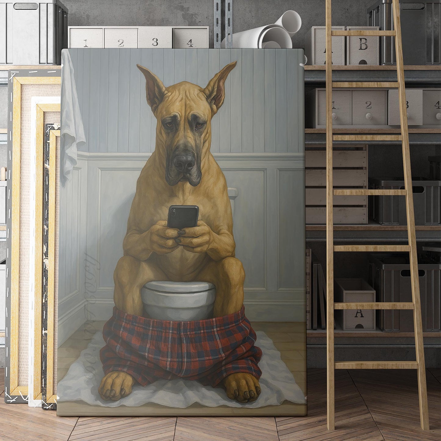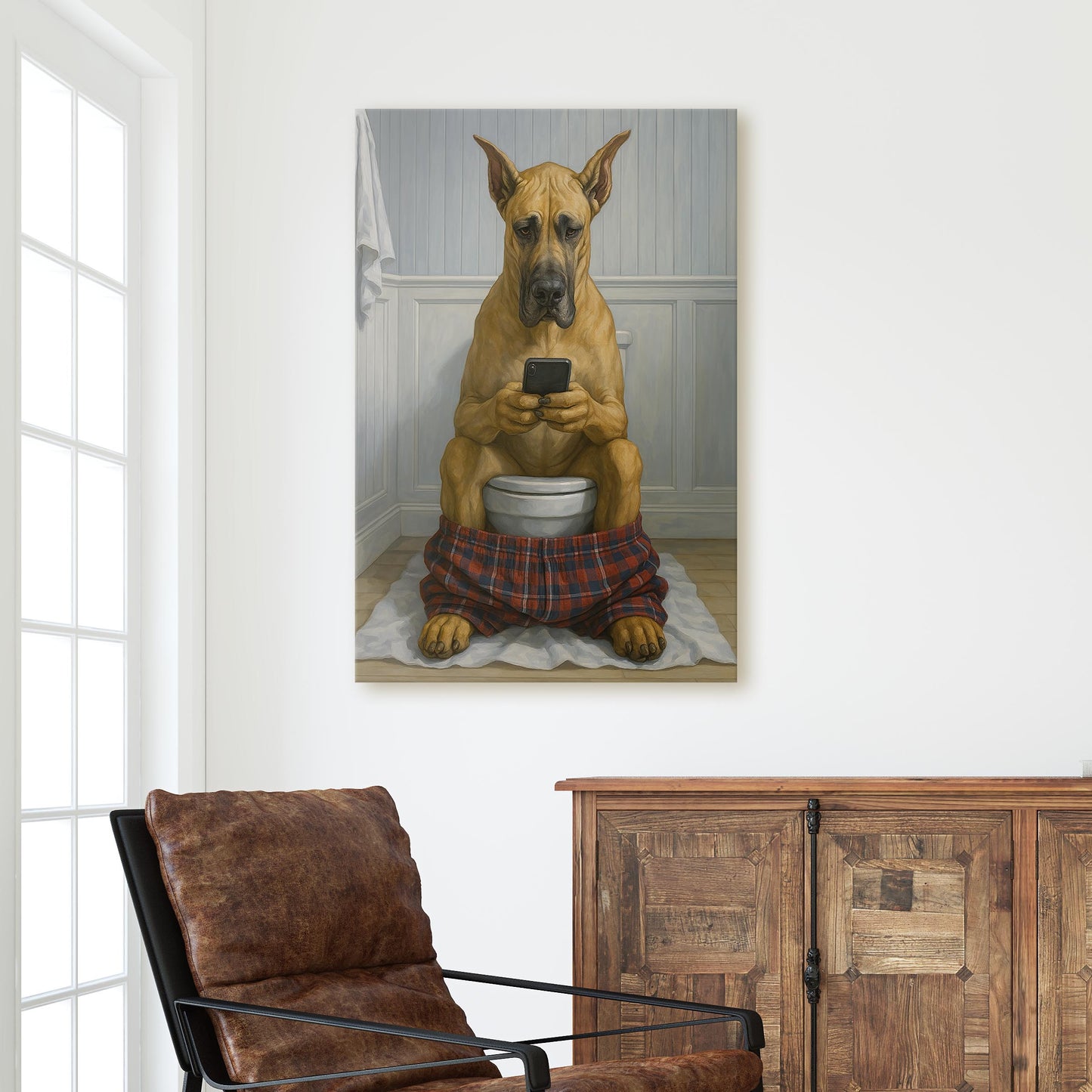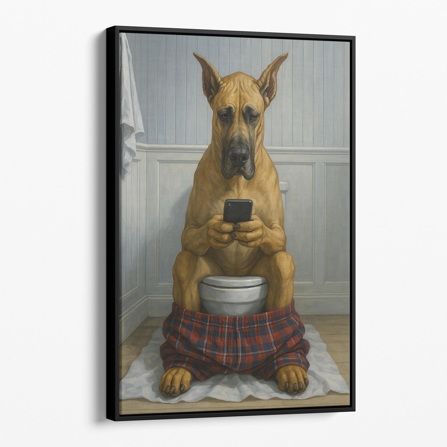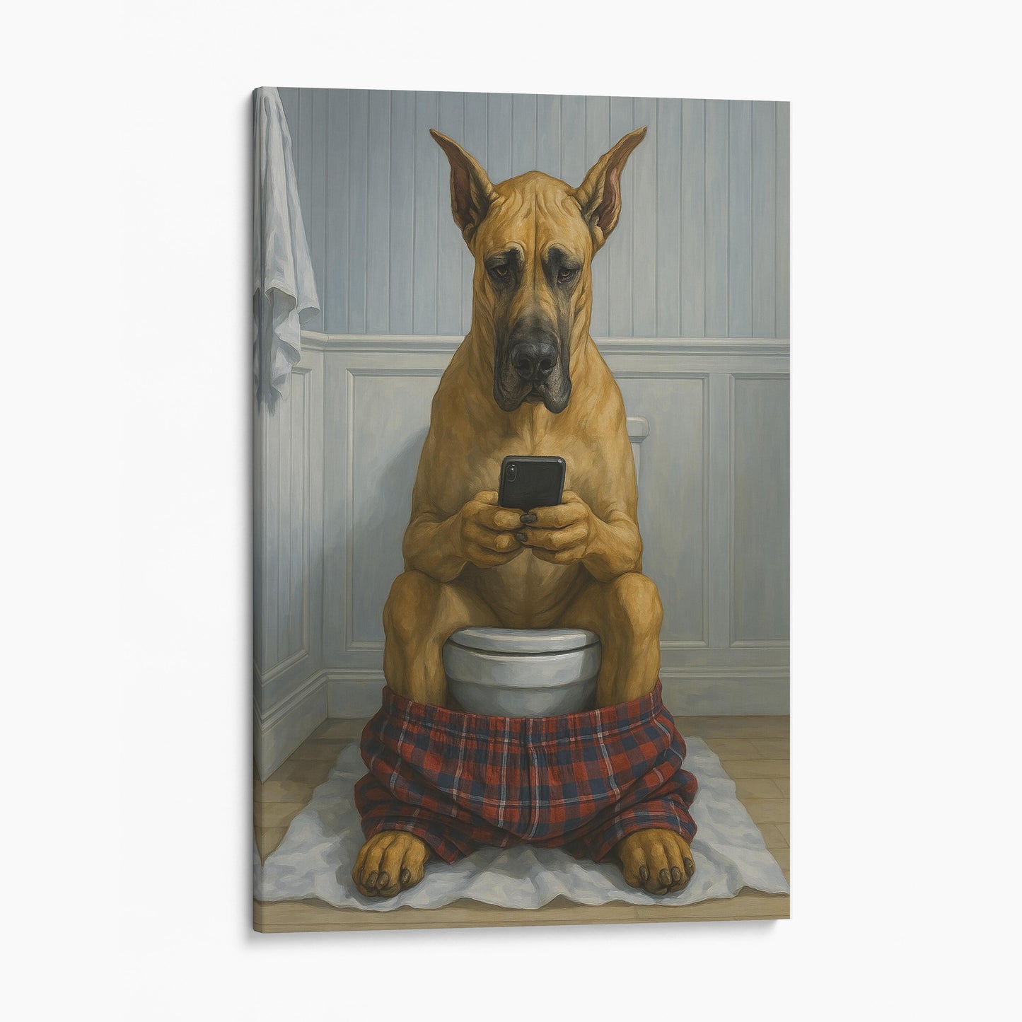 Great Dane On The Phone On The Toilet