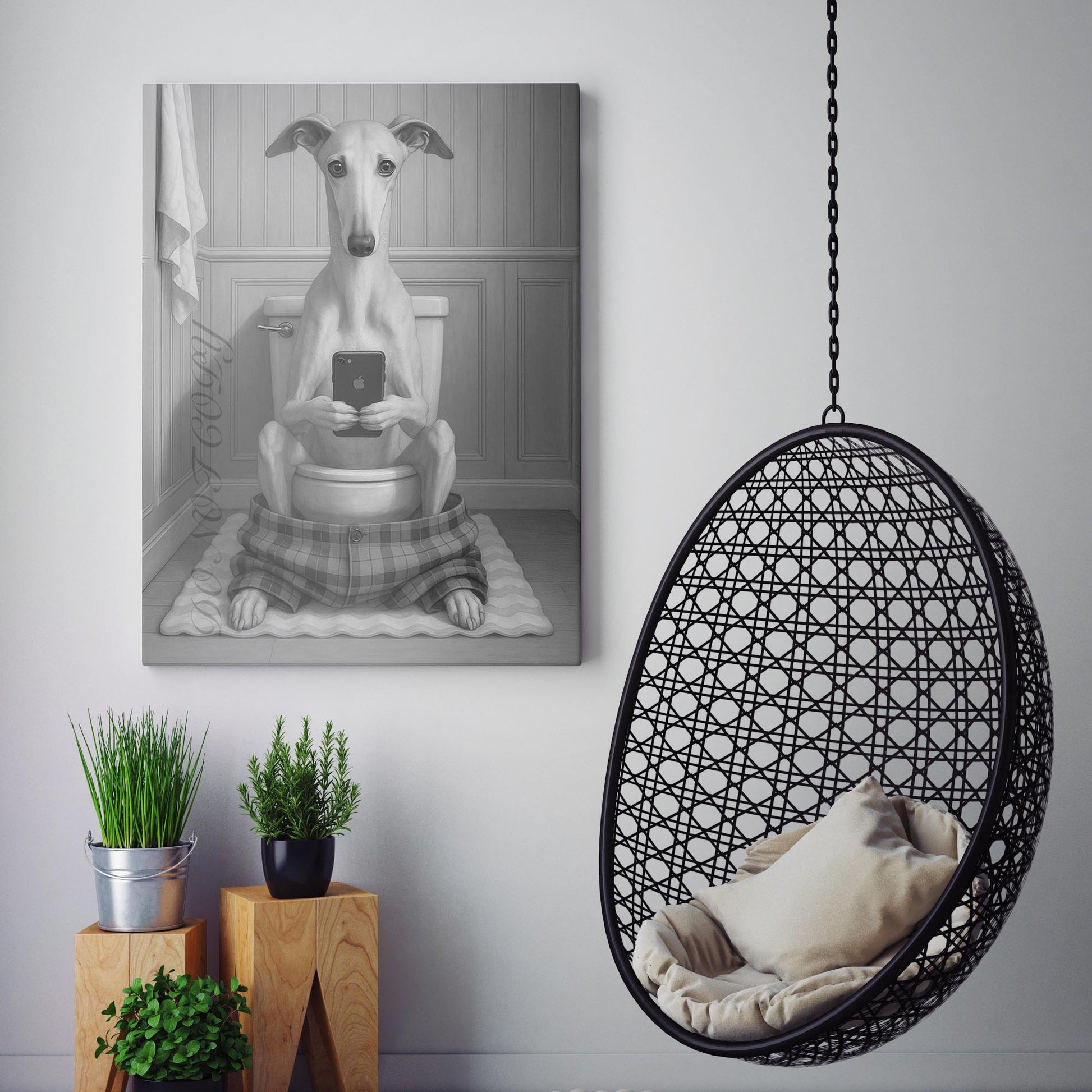 Greyhound Dog On The Phone On The Toilet