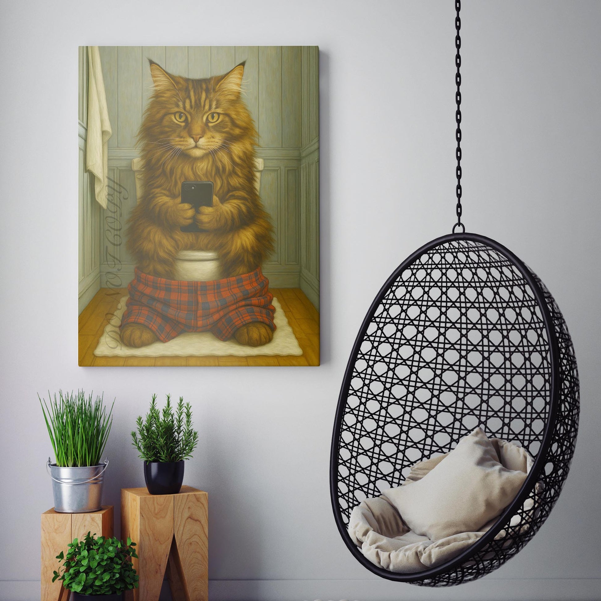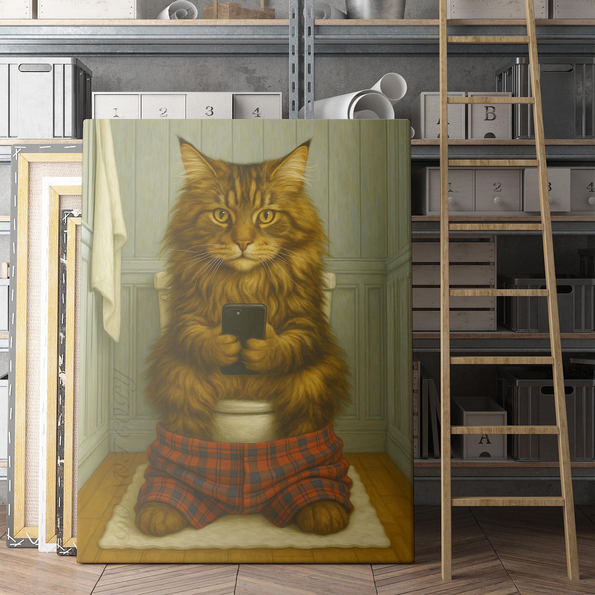 Maine Coon Cat On The Phone On The Toilet