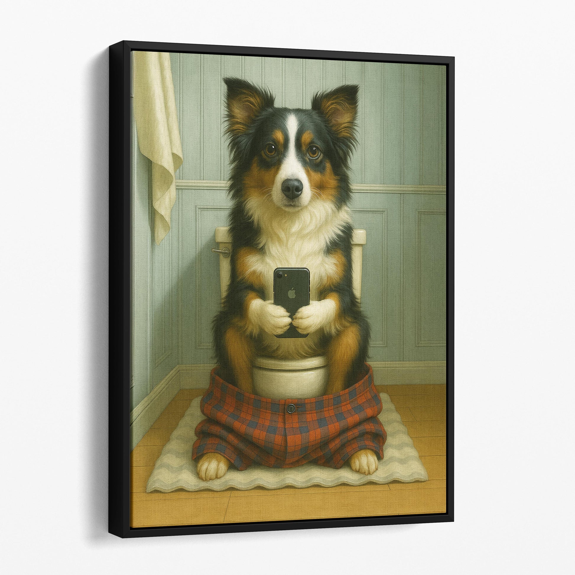 Miniature American Shepherd Dog On The Phone On The Toilet
