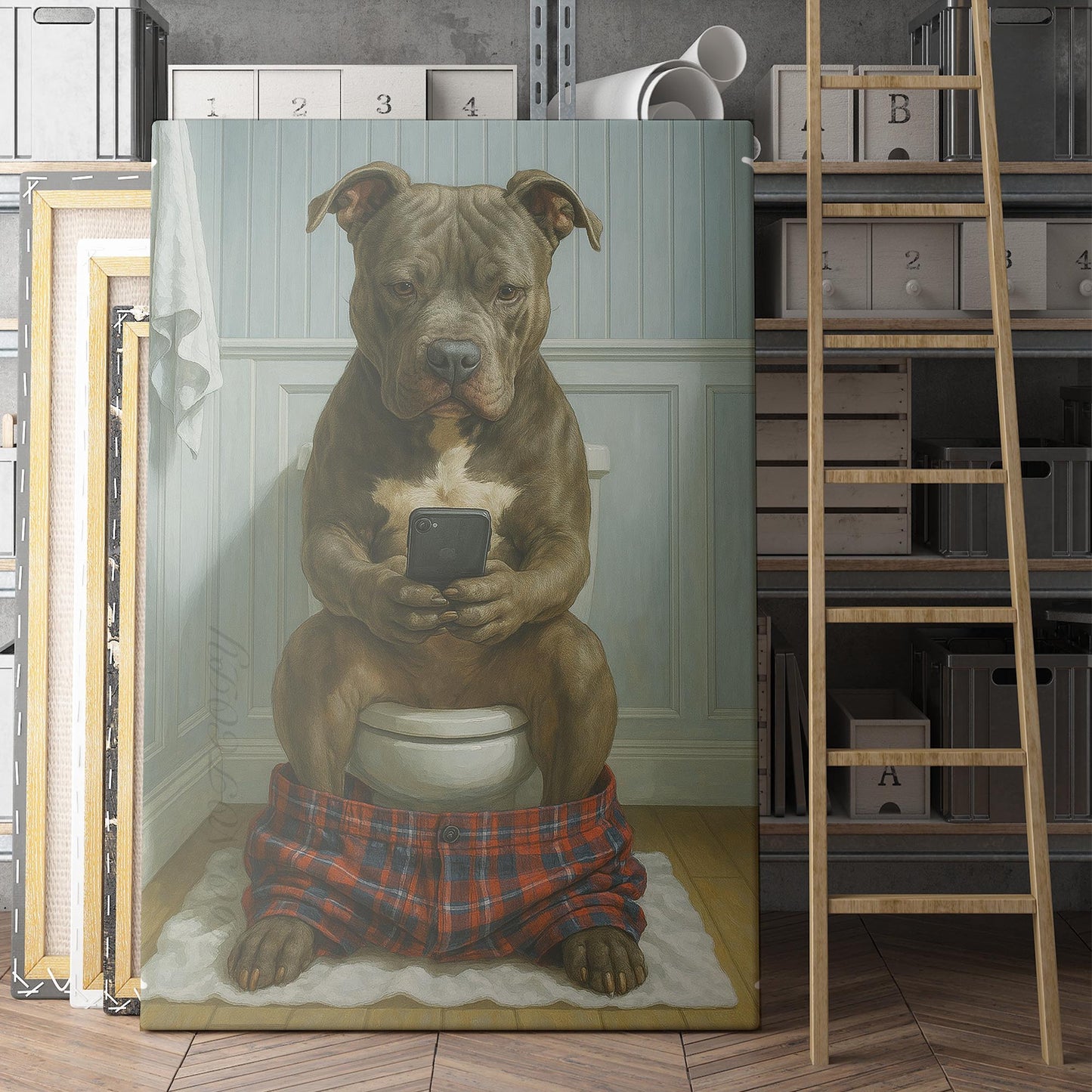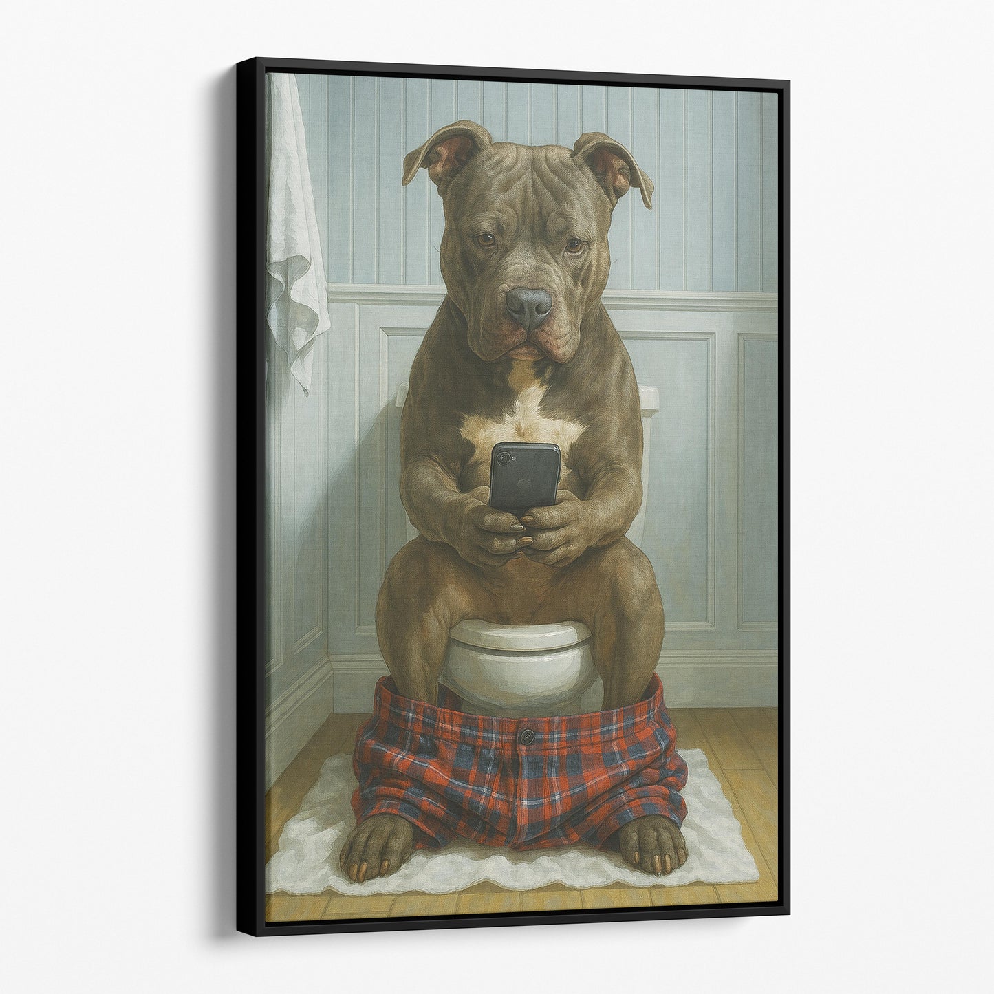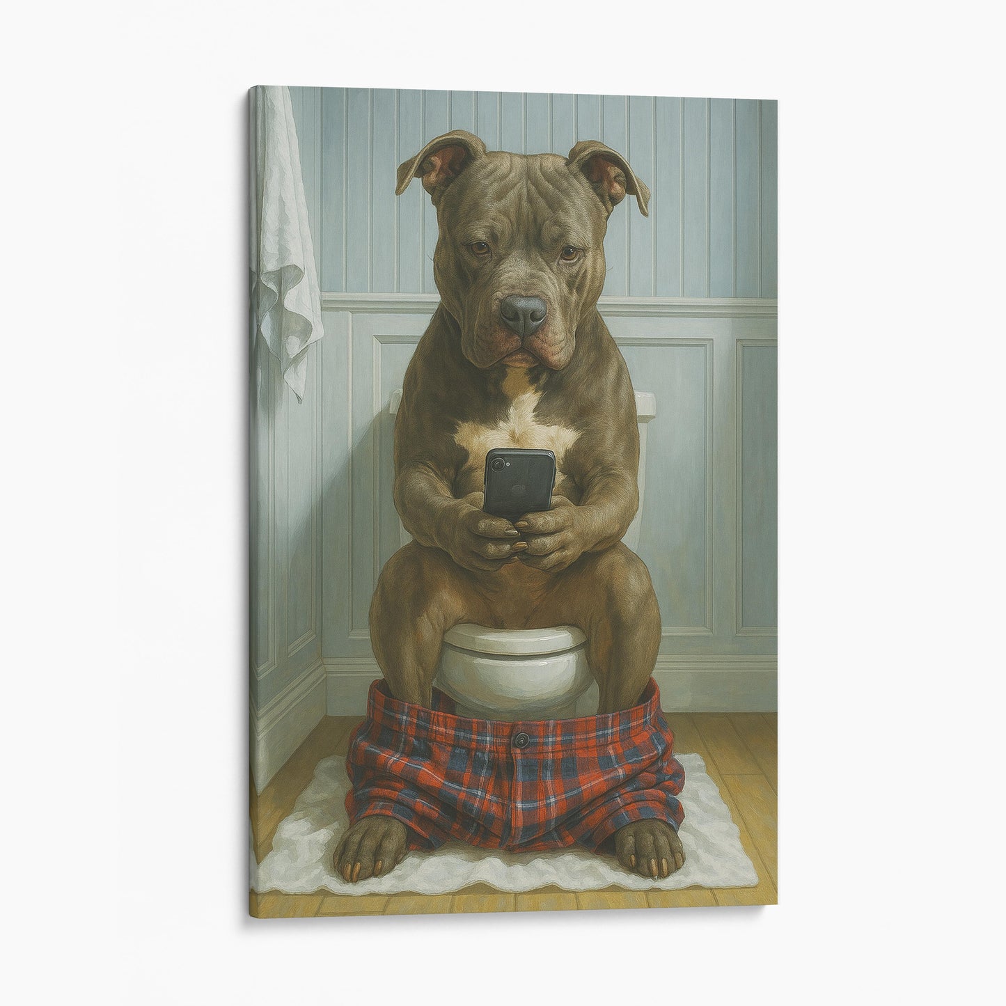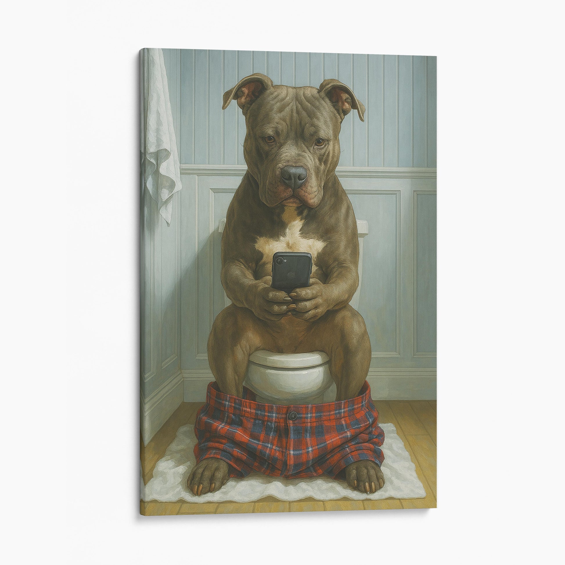 Pit Bull Terrier On The Phone On The Toilet