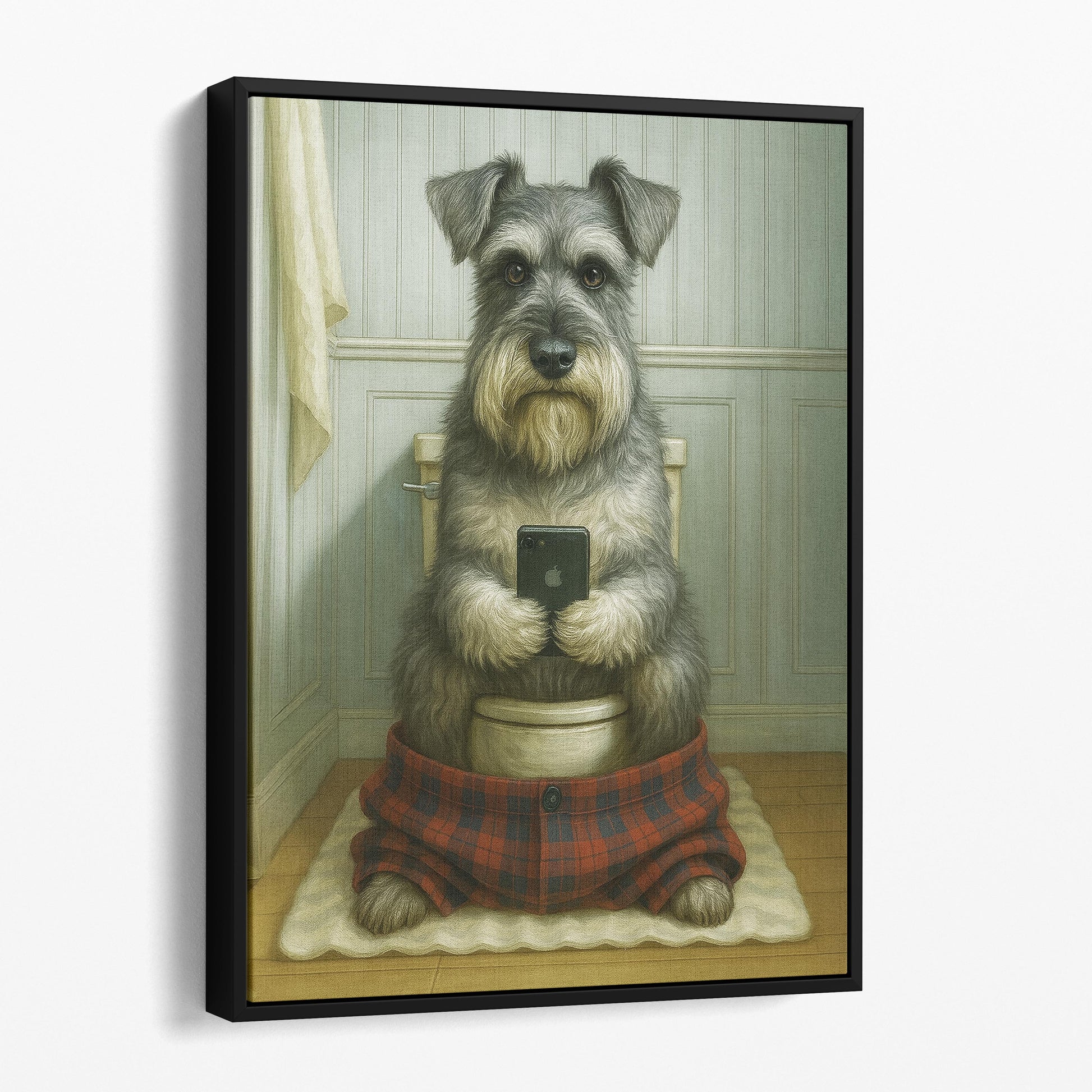 Schnauzer Dog On The Phone On The Toilet