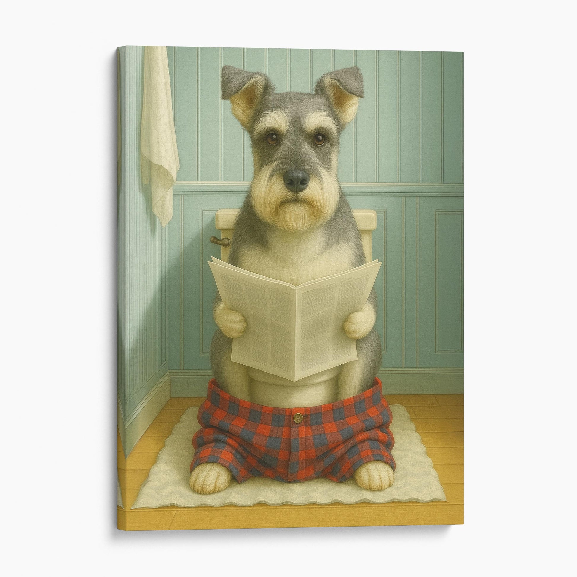 Schnauzer Dog Reading The Newspaper On The Toilet