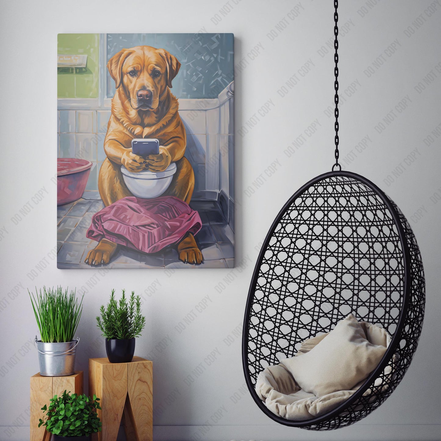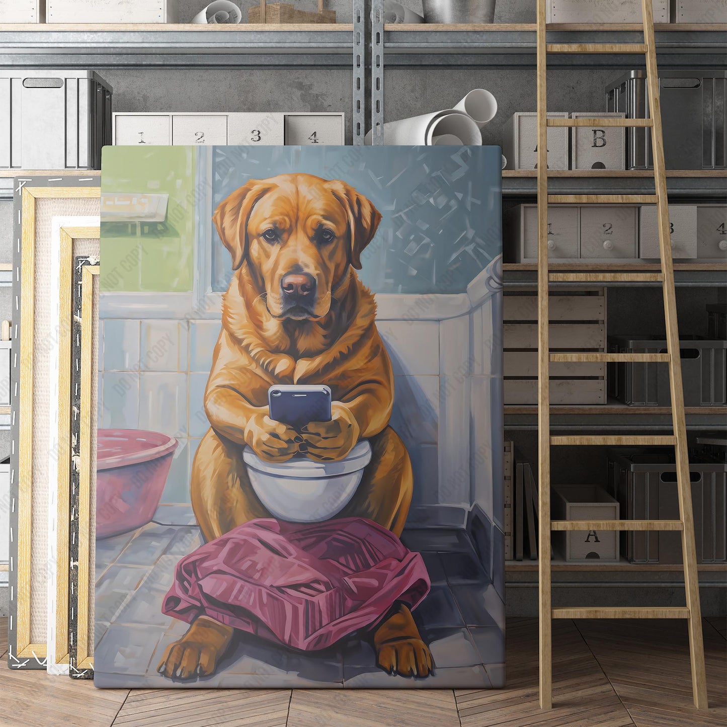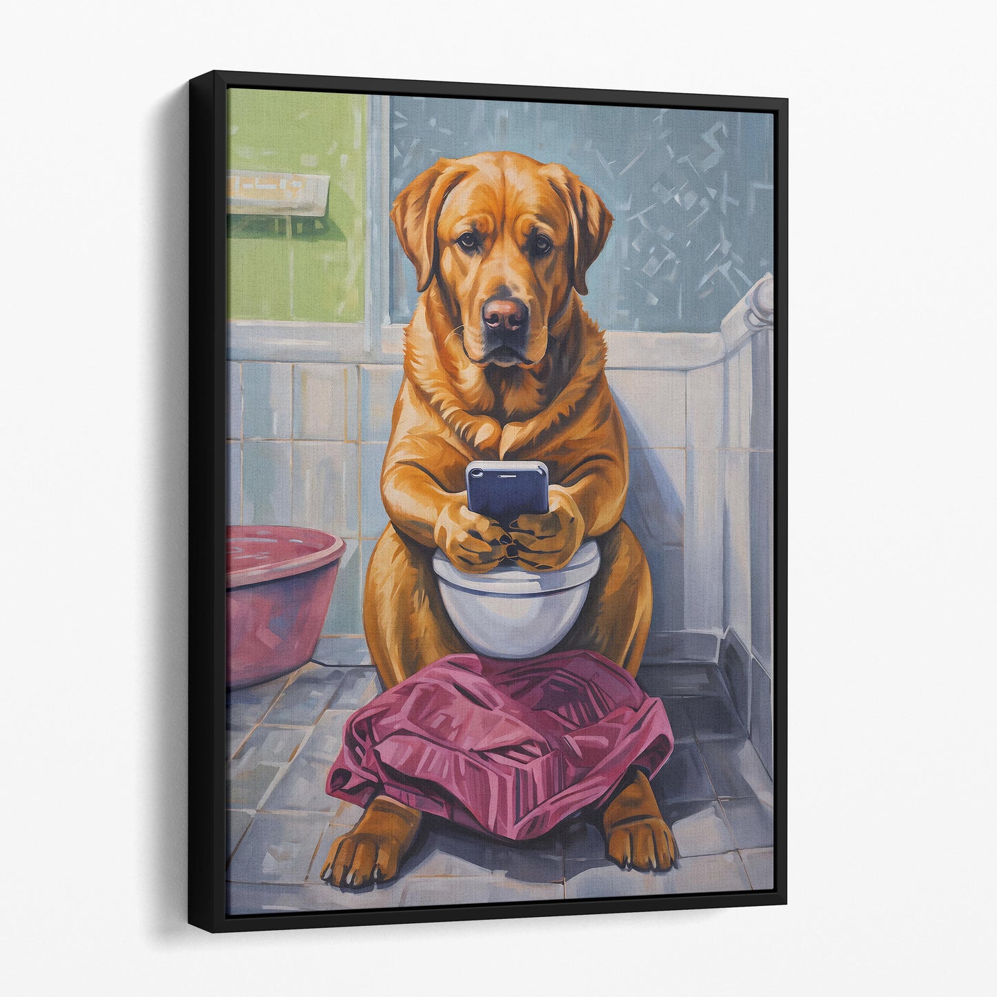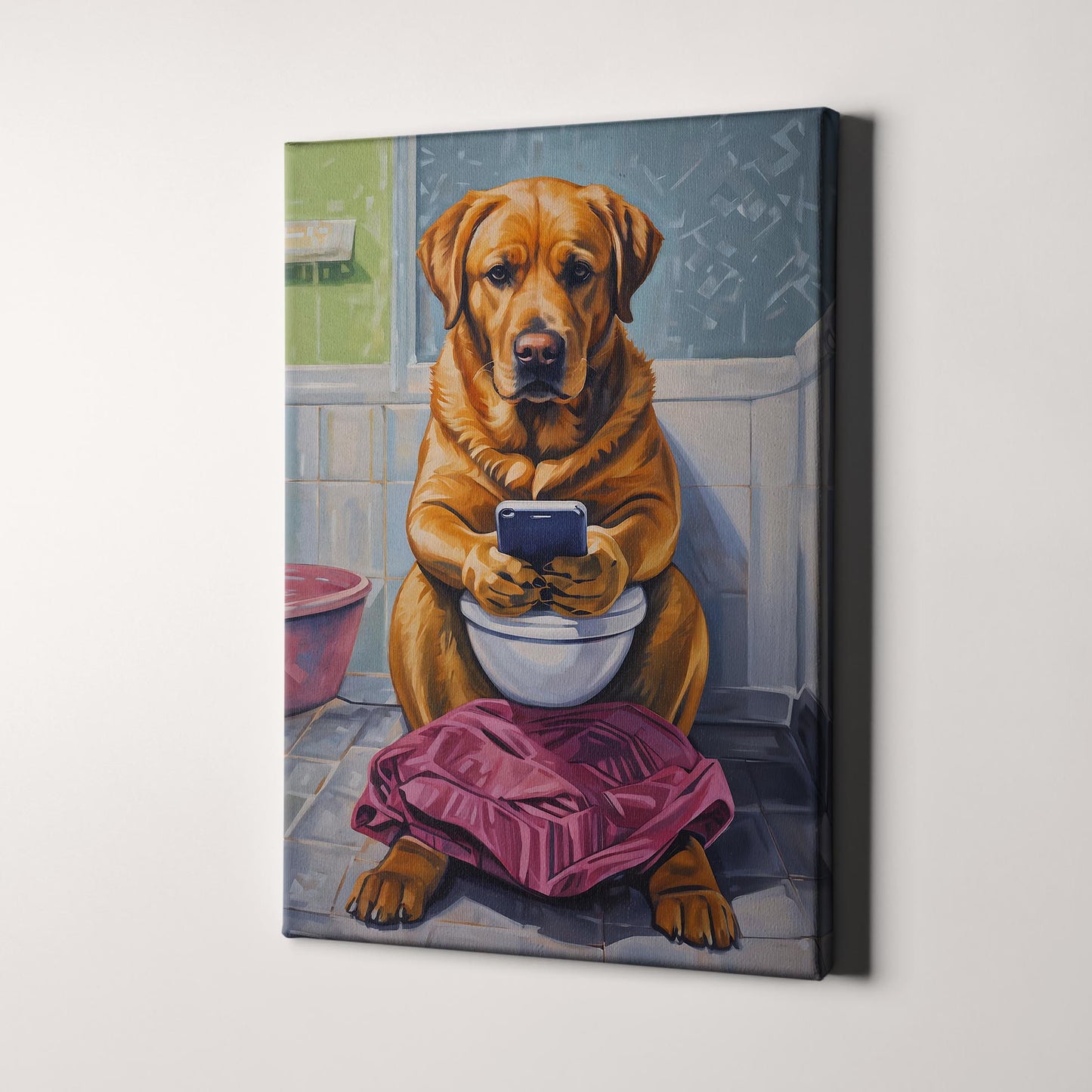 Yellow Labrador Retriever On Phone On The Toilet