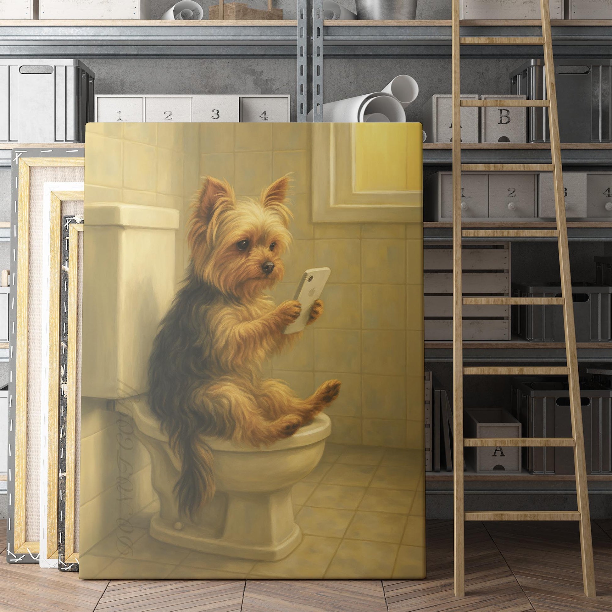 Yorkshire Terrier Dog On The Phone On The Toilet